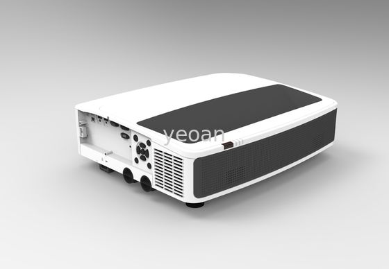 This ultra short throw projector features a sleek, modern design that blends seamlessly with any decor. Its unique 0.254:1 throw ratio allows placement just inches from the wall, creating large images without the need for ceiling mounting or long-distance projection - perfect for space-constrained environments.